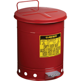 符合美国 OSHA 要求的油渍废品罐是在使用浸有溶剂的布和抹布时的必备品。浸有溶剂、稀释剂、亚麻籽油、可燃粘合剂和其他易燃液体的抹布和布如果随意抛弃,将有极大的火灾隐患。经过专门设计的盖子打开的角度不超过 60 度,不使用时将保持关闭,将内容物与火源隔离,限制氧气量,因此可有效地消除自燃隐患。圆形的构造和加高的罐底可促进罐体周围的空气流通,从而达到散热以及减少因水分聚集而生锈的目的。耐用的钢制构造采用耐化学腐蚀的粉末涂料涂饰。