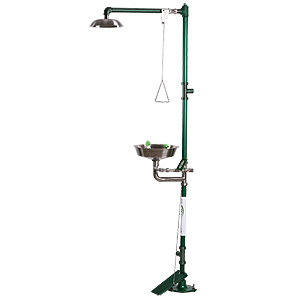 复合式淋浴洗眼器WG7052F配备ABS塑料水盆和带防尘盖的双不锈钢喷淋嘴。淋浴为大水流雨瀑淋浴头,配备镀锌钢支柱和拉杆。